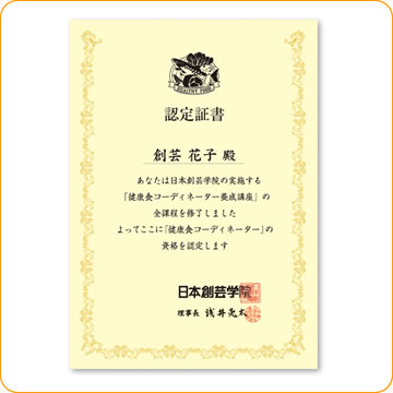 修了時に、「健康食コーディネーター」資格が取得できます。この資格は、食と健康のプロフェッショナルとして、本格的な知識と技能を身につけたことを証明するものです。